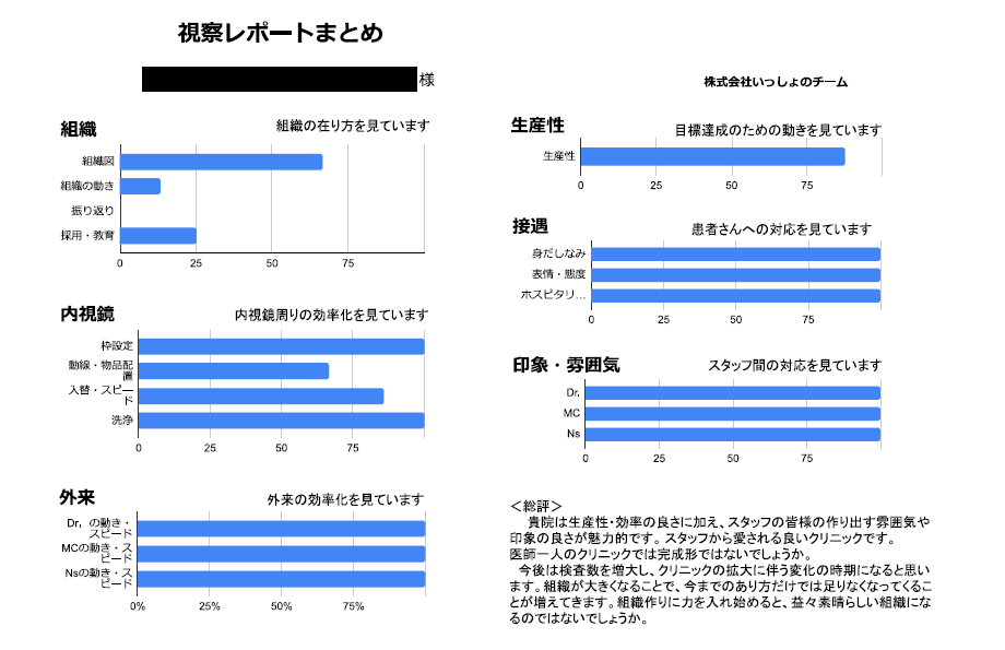 特に見てほしいところを指定できます。院長や事務長が気になっているがスタッフには伝えにくいところを、私たちが代わりに伝えることもできますので、ご相談ください。